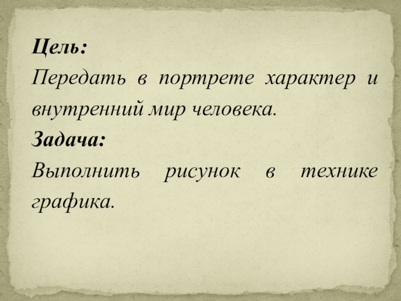 Цель: Передать в портрете характер и внутренний мир человека.Задача:Выполнить рисунок в технике графика.