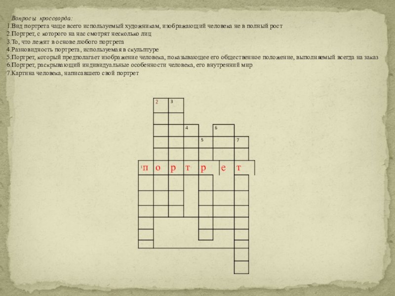 Вопросы кроссворда:Вид портрета чаще всего используемый художникам, изображающий человека не в полный ростПортрет, с которого на нас