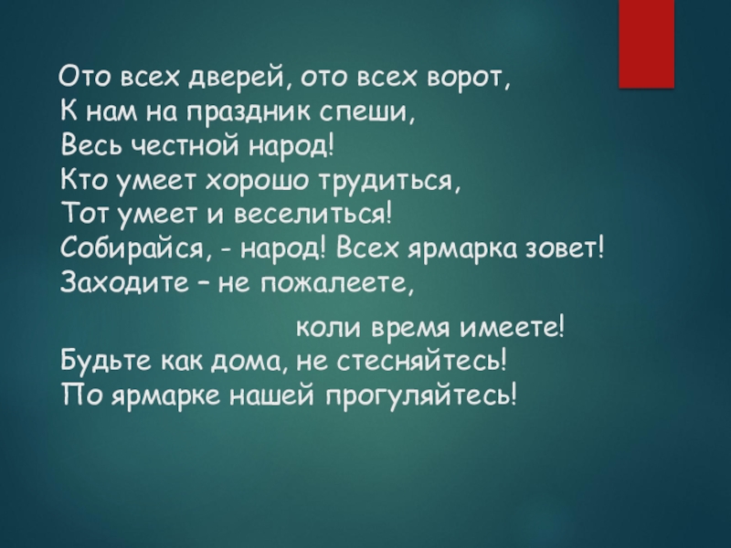 Ото всех дверей, ото всех ворот, К нам на праздник спеши, Весь честной народ! Кто умеет хорошо трудиться, Тот умеет и веселиться! Собирайся, - народ! Всех ярмарка зовет! Заходите – не пожалеете,