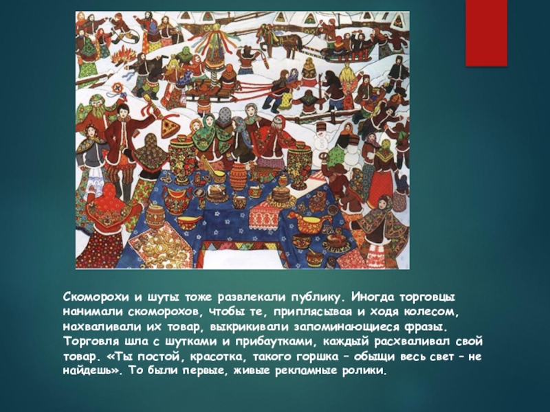 Слайд 5Скоморохи и шуты тоже развлекали публику. Иногда торговцы нанимали скоморохов, чтобы