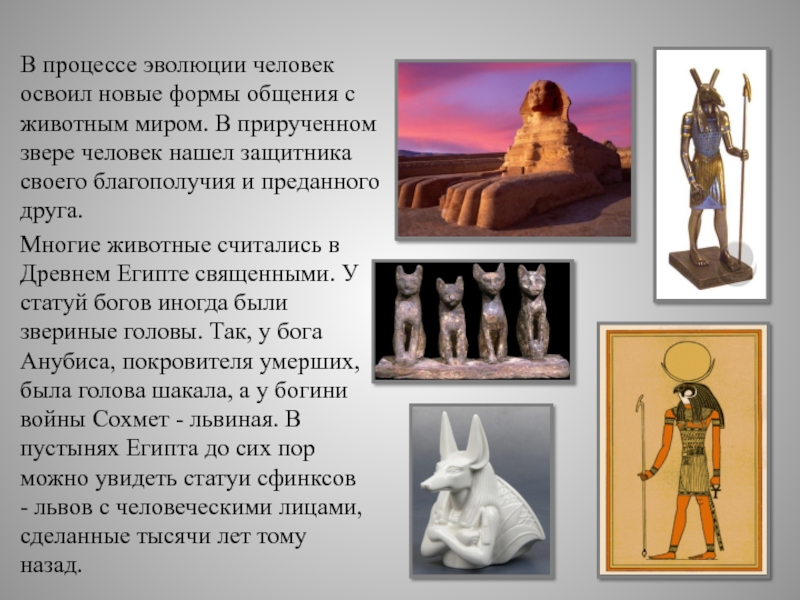 Многие животные считались в Древнем Египте священными. У статуй богов иногда были звериные головы. Так, у бога Анубиса, покровителя умерших, была голова шакала, а у богини войны Сохмет - львиная. В пустынях Египта до сих пор можно увидеть статуи сфинксов - львов с человеческими лицами, сделанные тысячи лет тому назад.