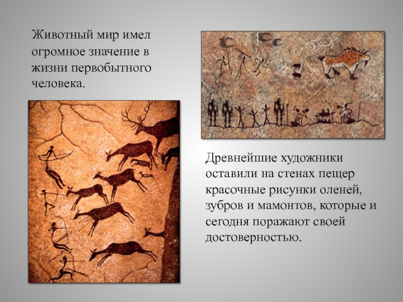 Древнейшие художники оставили на стенах пещер красочные рисунки оленей, зубров и мамонтов, которые и сегодня поражают своей достоверностью.