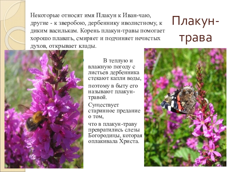 Некоторые относят имя Плакун к Иван-чаю, другие - к зверобою, дербеннику иволистному, к диким василькам. Корень плакун-травы помогает хорошо плавать, смиряет и подчиняет нечистых духов, открывает клады.