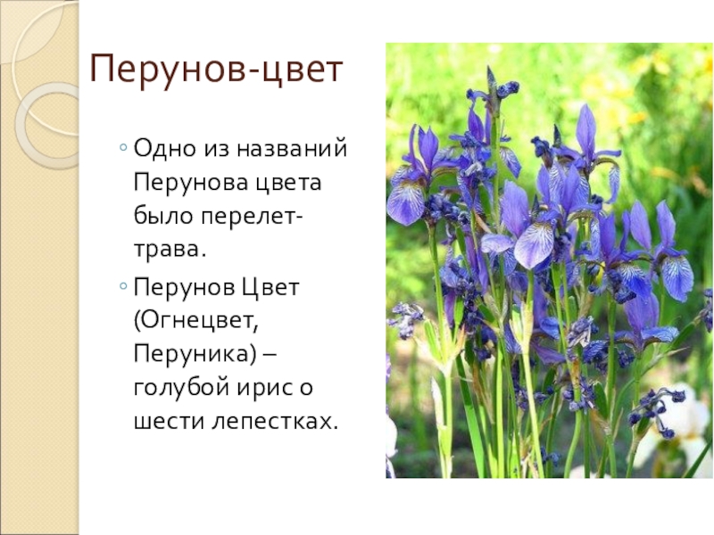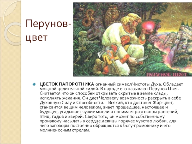его называют Перунов Цвет. Считается что он способен открывать скрытые в земле клады, исполнять желания. Он дает Человеку возможность раскрыть в себе Духовную Силу и Способности. Всякий, кто достанет Жар-цвет, становится вещим человеком, знает прошедшее, настоящее и будущее, угадывает чужие мысли и понимает разговоры растений, птиц, гадов и зверей. Сверх того, он может по собственному произволу насылать в сердце девицы горячее чувство любви, для чего заговоры постоянно обращаются к богу-громовнику и его молниеносным стрелам.