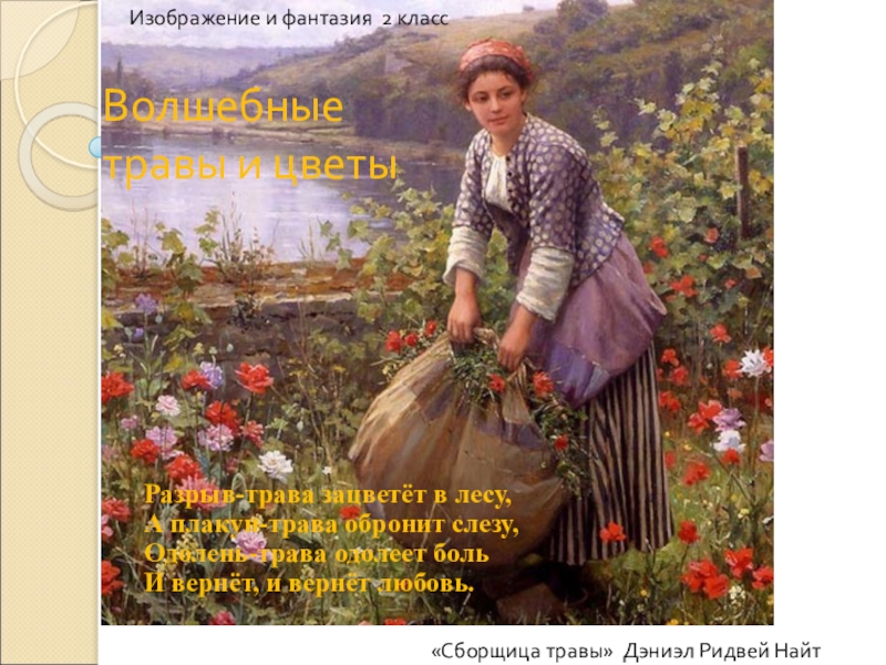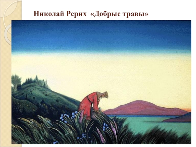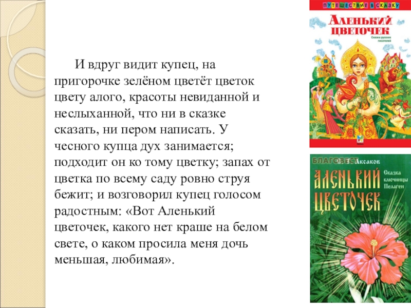 Слайд 16 И вдруг видит купец, на пригорочке зелёном цветёт цветок цвету алого,
