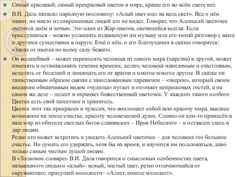 В.И. Даль записал народную пословицу: «Алый цвет мил на весь свет». Все о нём знают, но никто из современных людей его не видел. Говорят, что Аленький цветочек светится днём и ночью. Это один из Жар-цветов, светящийся всегда. Если прислушаться – можно услышать издаваемую им музыку или его тихий разговор с вами и другими существами в округе. Ещё о нём, о его благоухании в сказке говорится: «Запах от цветка по всему саду бежит».