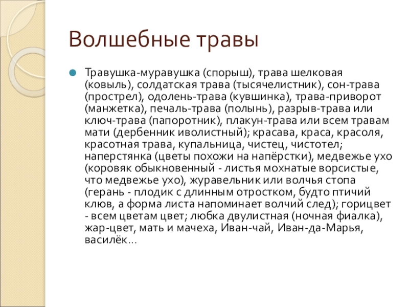 одолень-трава (кувшинка), трава-приворот (манжетка), печаль-трава (полынь), разрыв-трава или ключ-трава (папоротник), плакун-трава или всем травам мати (дербенник иволистный); красава, краса, красоля, красотная трава, купальница, чистец, чистотел; наперстянка (цветы похожи на напёрстки), медвежье ухо (коровяк обыкновенный - листья мохнатые ворсистые, что медвежье ухо), журавельник или волчья стопа (герань - плодик с длинным отростком, будто птичий клюв, а форма листа напоминает волчий след); горицвет - всем цветам цвет; любка двулистная (ночная фиалка), жар-цвет, мать и мачеха, Иван-чай, Иван-да-Марья, василёк...