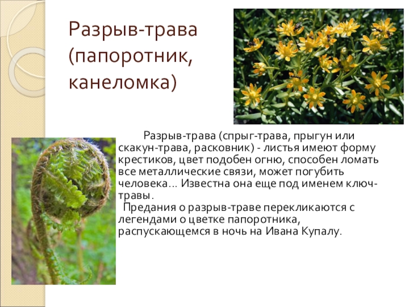 Предания о разрыв-траве перекликаются с легендами о цветке папоротника, распускающемся в ночь на Ивана Купалу.