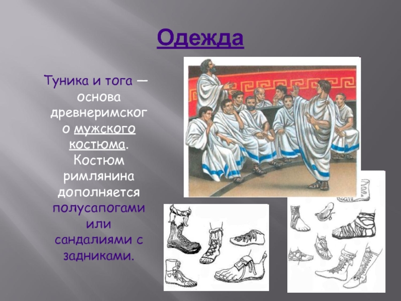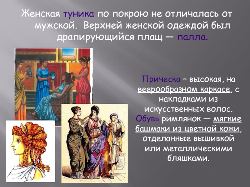 Обувь римлянок — мягкие башмаки из цветной кожи, отделанные вышивкой или металлическими бляшками.