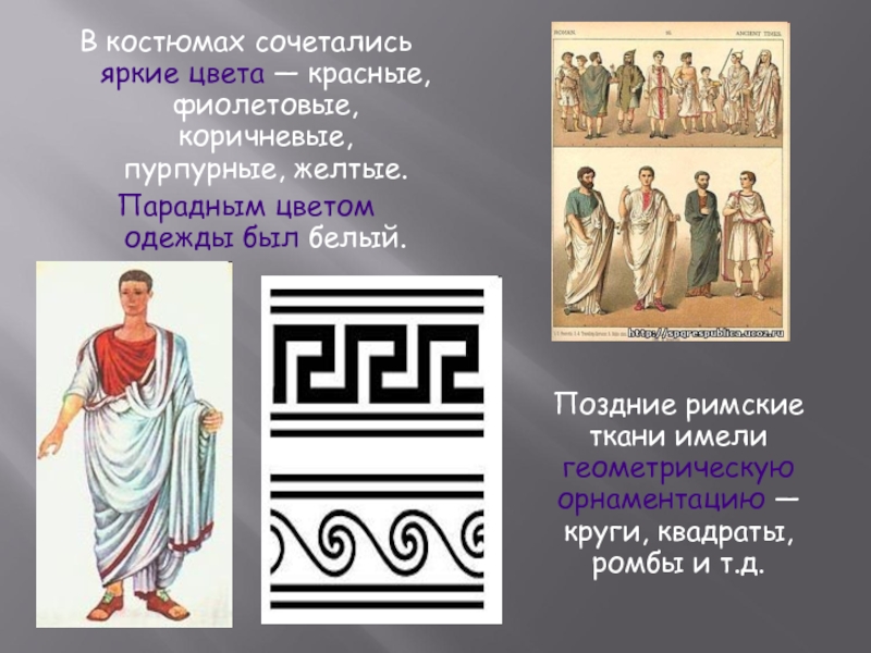 Поздние римские ткани имели геометрическую орнаментацию — круги, квадраты, ромбы и т.д.