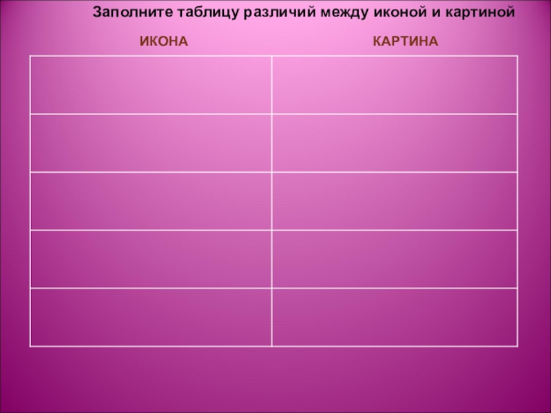 Слайд 7Заполните таблицу различий между иконой и картиной