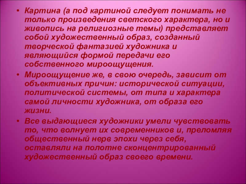 но и живопись на религиозные темы) представляет собой художественный образ, созданный творческой фантазией художника и являющийся формой передачи его собственного мироощущения.
