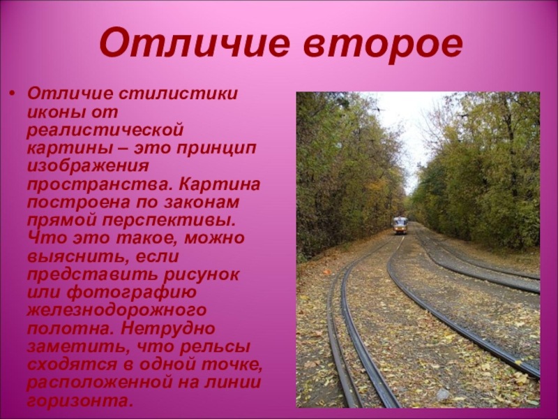 пространства. Картина построена по законам прямой перспективы. Что это такое, можно выяснить, если представить рисунок или фотографию железнодорожного полотна. Нетрудно заметить, что рельсы сходятся в одной точке, расположенной на линии горизонта.
