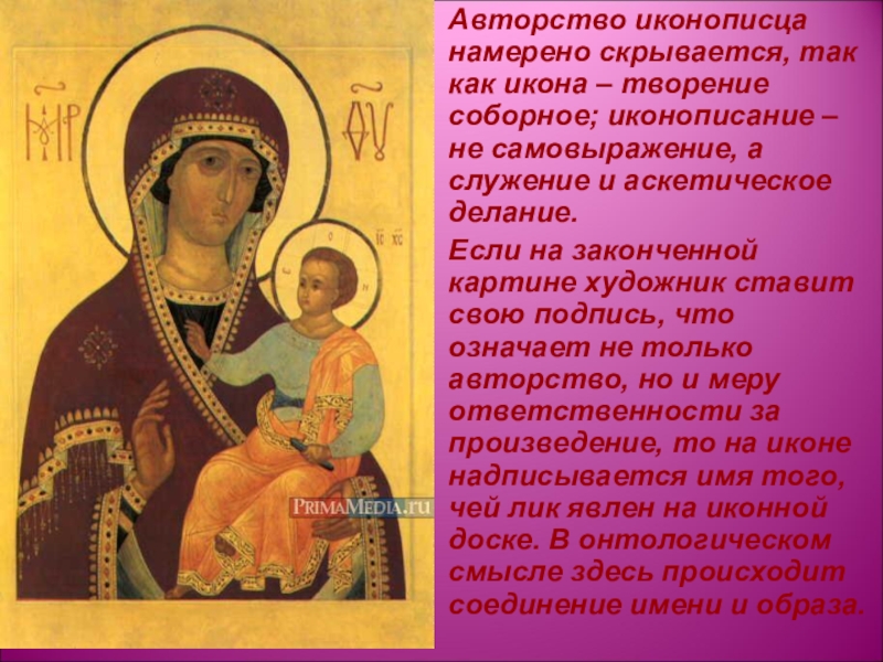 Авторство иконописца намерено скрывается, так как икона – творение соборное; иконописание