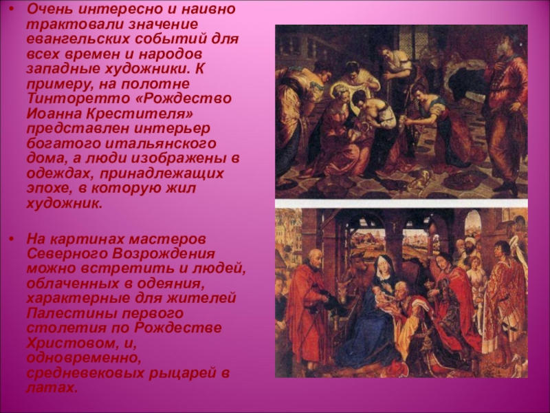 и народов западные художники. К примеру, на полотне Тинторетто «Рождество Иоанна Крестителя» представлен интерьер богатого итальянского дома, а люди изображены в одеждах, принадлежащих эпохе, в которую жил художник.