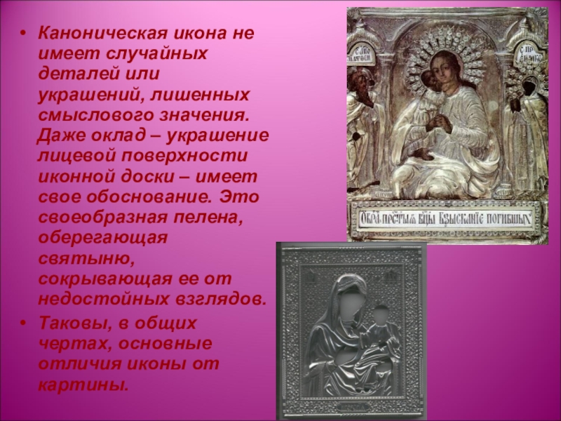 Даже оклад – украшение лицевой поверхности иконной доски – имеет свое обоснование. Это своеобразная пелена, оберегающая святыню, сокрывающая ее от недостойных взглядов.