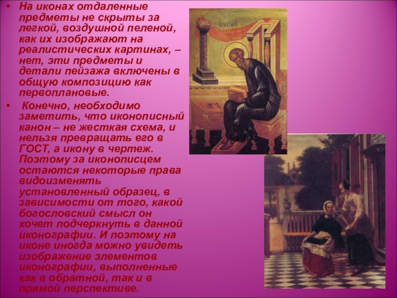 Слайд 20На иконах отдаленные предметы не скрыты за легкой, воздушной пеленой, как