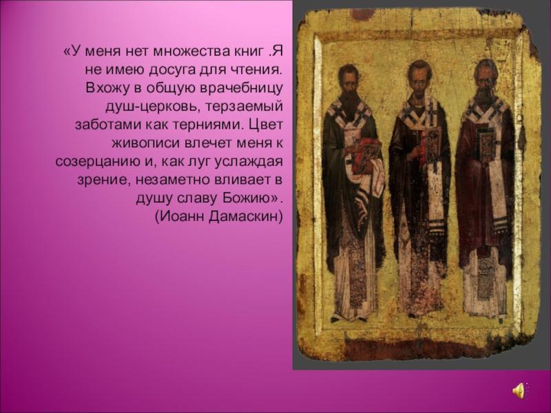 Вхожу в общую врачебницу душ-церковь, терзаемый заботами как терниями. Цвет живописи влечет меня к созерцанию и, как луг услаждая зрение, незаметно вливает в душу славу Божию».