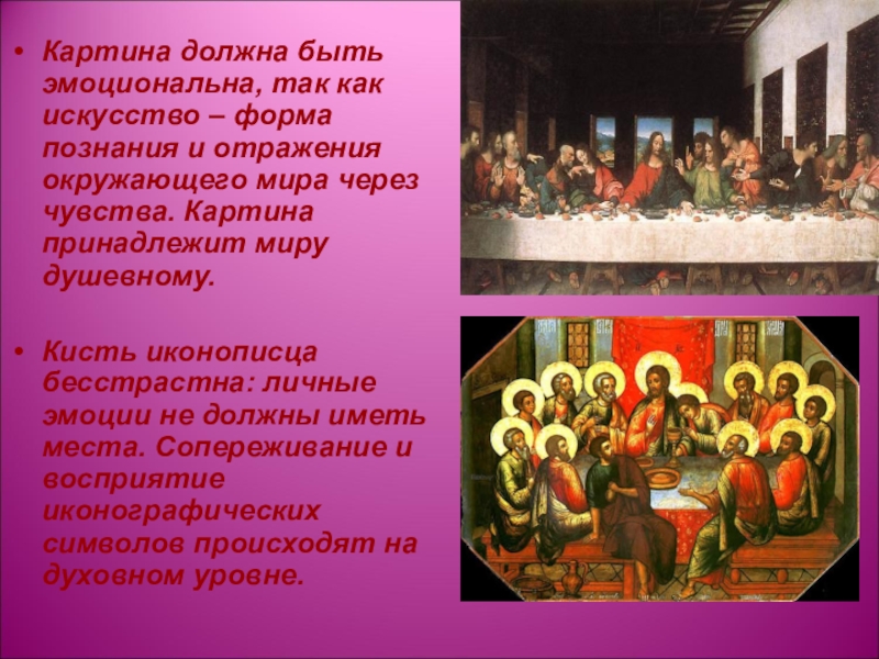 Кисть иконописца бесстрастна: личные эмоции не должны иметь места. Сопереживание и восприятие иконографических символов происходят на духовном уровне.