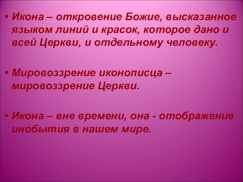 Слайд 9Икона – откровение Божие, высказанное языком линий и красок, которое дано