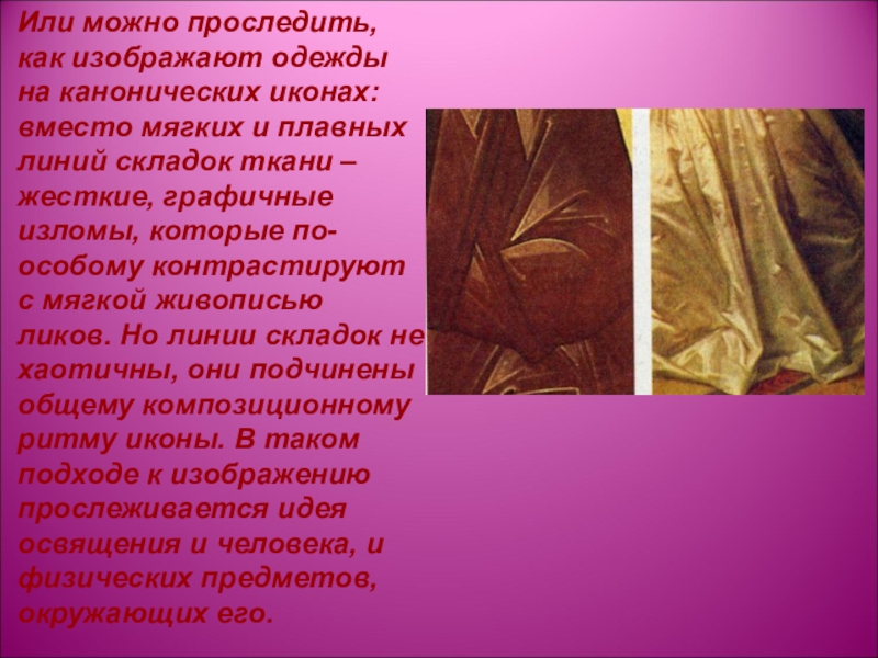Слайд 16Или можно проследить, как изображают одежды на канонических иконах: вместо мягких