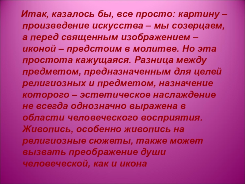 – мы созерцаем, а перед священным изображением – иконой – предстоим в молитве. Но эта простота кажущаяся. Разница между предметом, предназначенным для целей религиозных и предметом, назначение которого – эстетическое наслаждение не всегда однозначно выражена в области человеческого восприятия. Живопись, особенно живопись на религиозные сюжеты, также может вызвать преображение души человеческой, как и икона