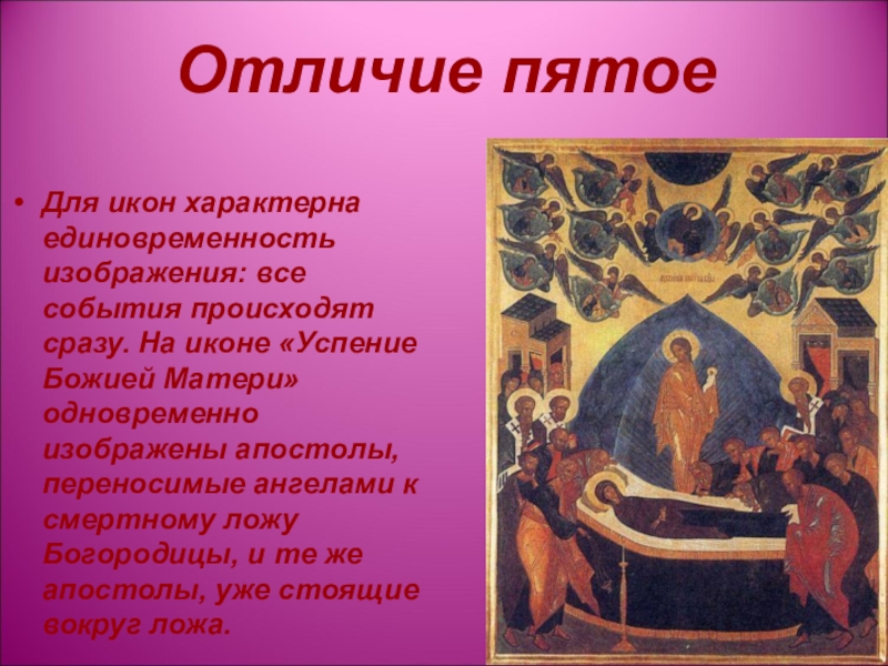 Для икон характерна единовременность изображения: все события происходят сразу. На