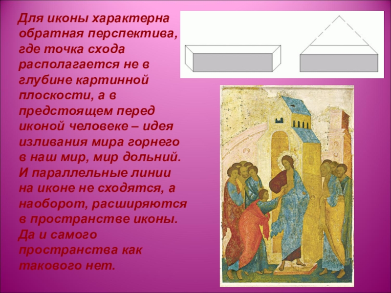 Слайд 19 Для иконы характерна обратная перспектива, где точка схода располагается