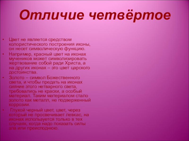 Например, красный цвет на иконах мучеников может символизировать жертвование собой ради Христа, а на других иконах – это цвет царского достоинства.