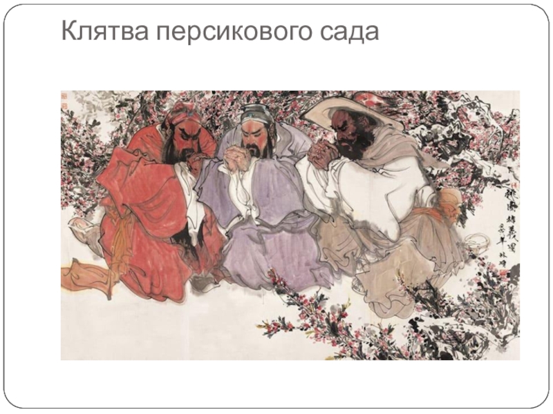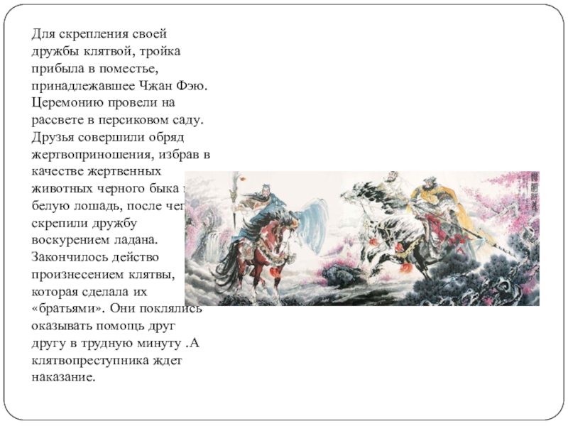 Слайд 23Для скрепления своей дружбы клятвой, тройка прибыла в поместье, принадлежавшее Чжан