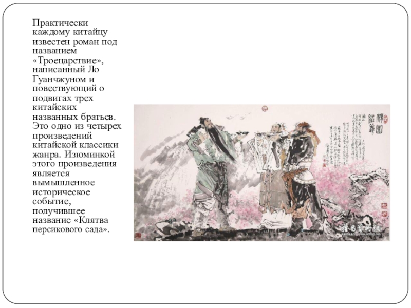 Слайд 22Практически каждому китайцу известен роман под названием «Троецарствие», написанный Ло Гуанчжуном