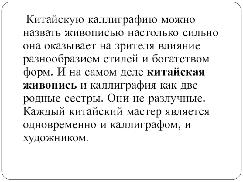 Слайд 10 Китайскую каллиграфию можно назвать живописью настолько сильно она оказывает