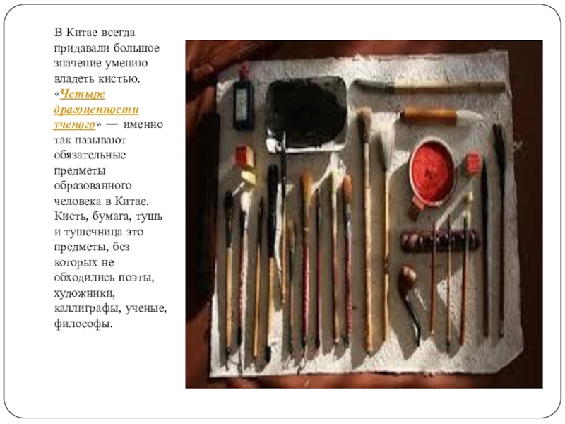 Слайд 4В Китае всегда придавали большое значение умению владеть кистью. «Четыре драгоценности