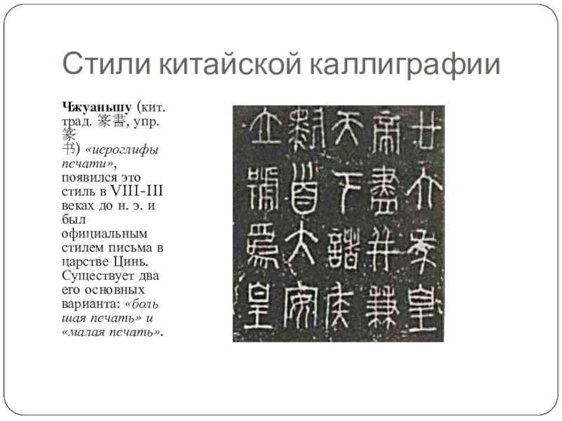 Чжуаньшу (кит.трад. 篆書, упр. 篆书) «иероглифы печати», появился это стиль в