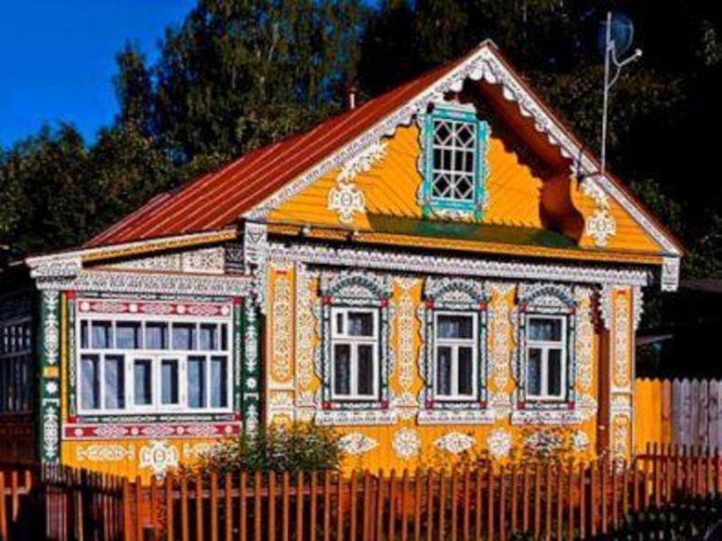 углы приподняты, что рождает сходство с крыльями птицы. Такая крыша великолепно защищала от дождя и по поверьям препятствовала проникновению в дом злых духов (которые умеют двигаться только по прямой).