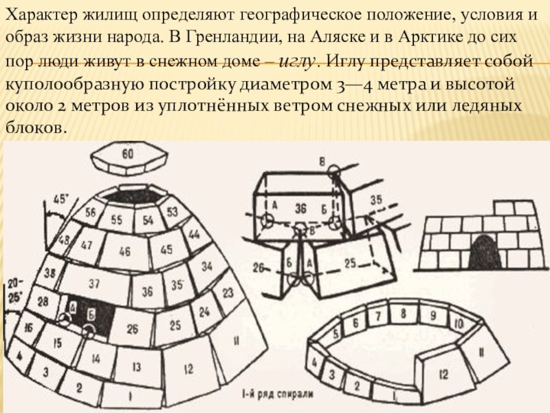 Гренландии, на Аляске и в Арктике до сих пор люди живут в снежном доме – иглу. Иглу представляет собой куполообразную постройку диаметром 3—4 метра и высотой около 2 метров из уплотнённых ветром снежных или ледяных блоков.
