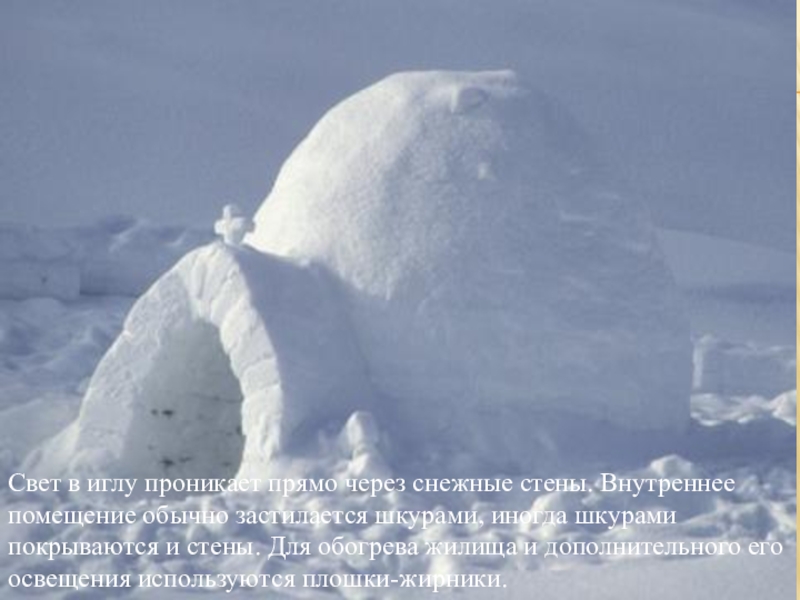 Слайд 8Свет в иглу проникает прямо через снежные стены. Внутреннее помещение обычно