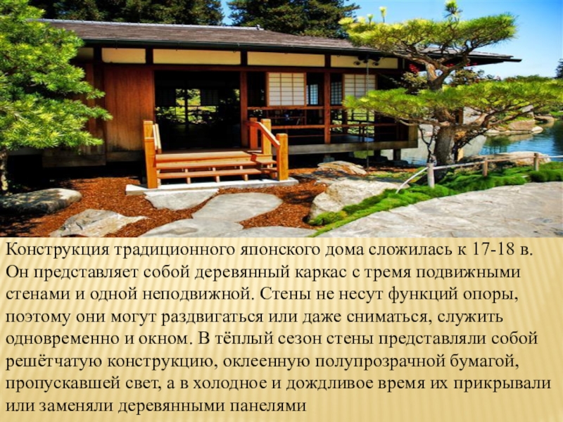 Слайд 14Конструкция традиционного японского дома сложилась к 17-18 в. Он представляет собой