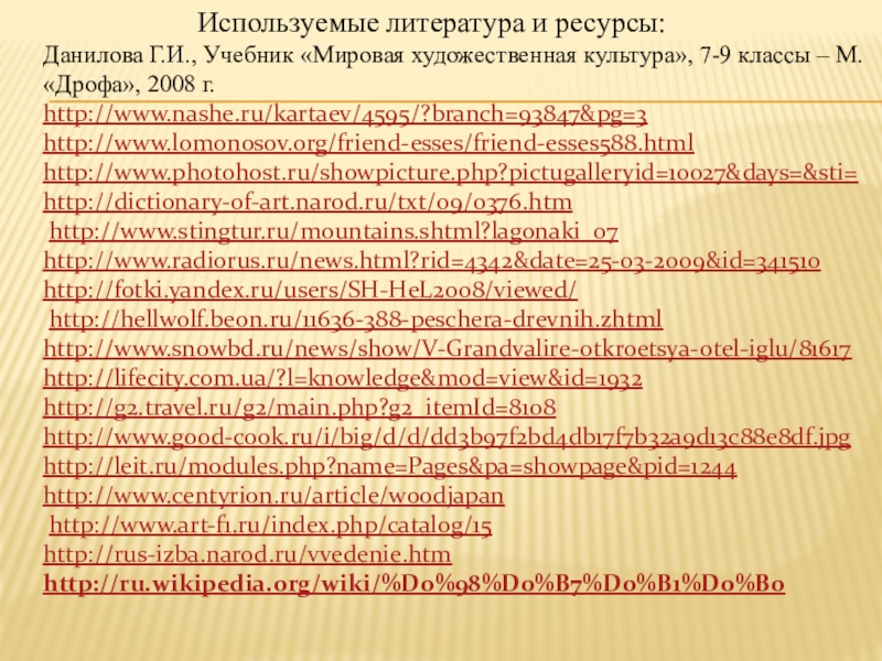 Данилова Г.И., Учебник «Мировая художественная культура», 7-9 классы – М. «Дрофа», 2008 г.