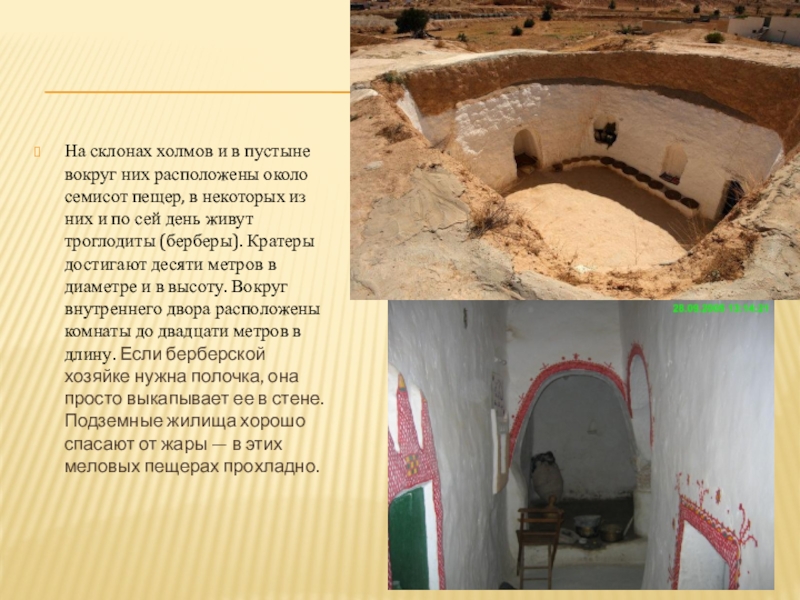 пещер, в некоторых из них и по сей день живут троглодиты (берберы). Кратеры достигают десяти метров в диаметре и в высоту. Вокруг внутреннего двора расположены комнаты до двадцати метров в длину. Если берберской хозяйке нужна полочка, она просто выкапывает ее в стене. Подземные жилища хорошо спасают от жары — в этих меловых пещерах прохладно.