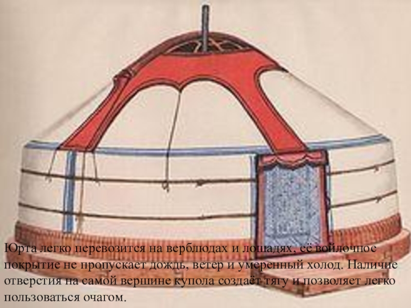 Слайд 12Юрта легко перевозится на верблюдах и лошадях, её войлочное покрытие не