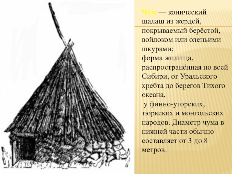 Слайд 10Чум — конический шалаш из жердей, покрываемый берёстой, войлоком или оленьими