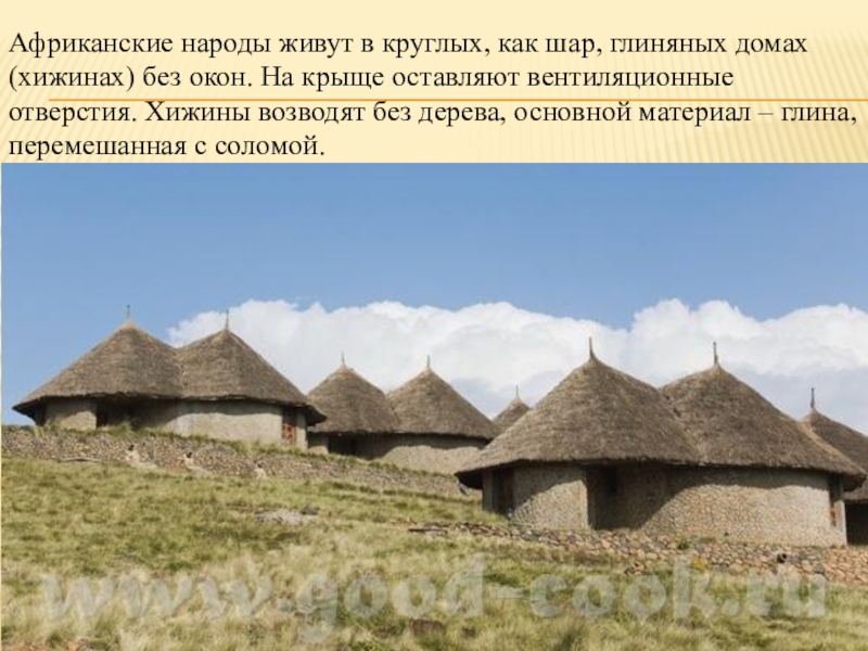 Слайд 13Африканские народы живут в круглых, как шар, глиняных домах (хижинах) без