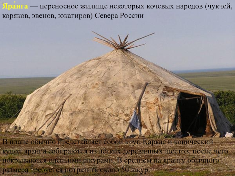 Слайд 9Яра́нга — переносное жилище некоторых кочевых народов (чукчей, коряков, эвенов, юкагиров) Севера