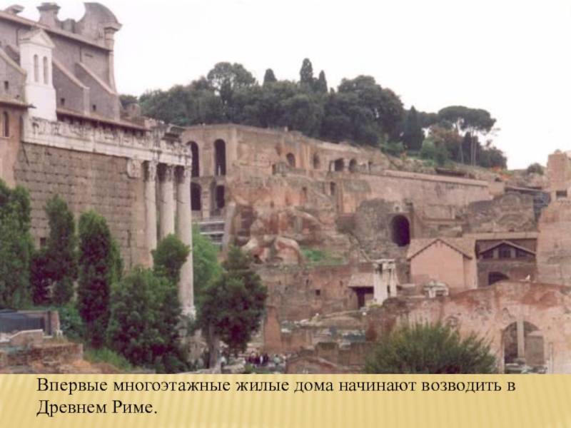 Слайд 5Впервые многоэтажные жилые дома начинают возводить в Древнем Риме.