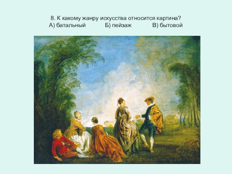 8. К какому жанру искусства относится картина? А) батальный      Б) пейзаж