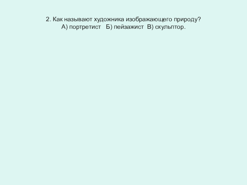 2. Как называют художника изображающего природу? А) портретист  Б) пейзажист В) скульптор.