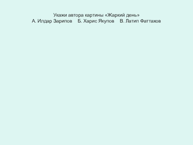 Слайд 4Укажи автора картины «Жаркий день» А. Илдар Зарипов Б. Харис Якупов