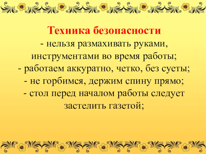 Слайд 8Техника безопасности - нельзя размахивать руками, инструментами во время работы; - работаем