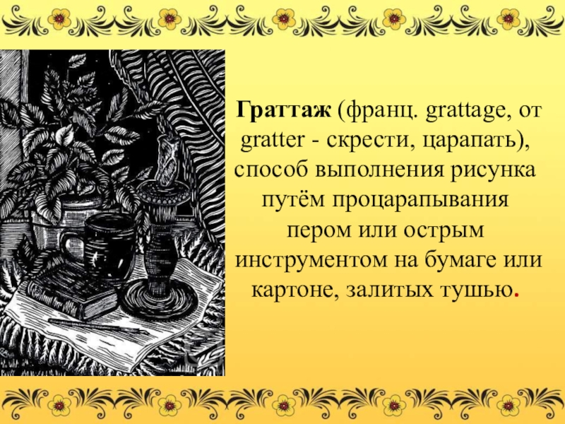 Слайд 6Граттаж (франц. grattage, от gratter - скрести, царапать), способ выполнения рисунка путём